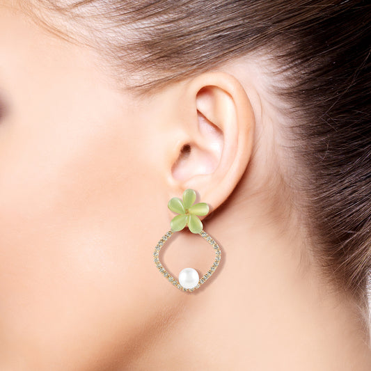 Elegant Stone Green Flower With Pearl Stud Earring For Women