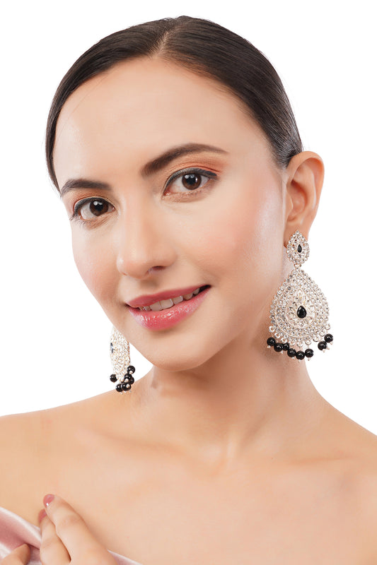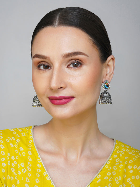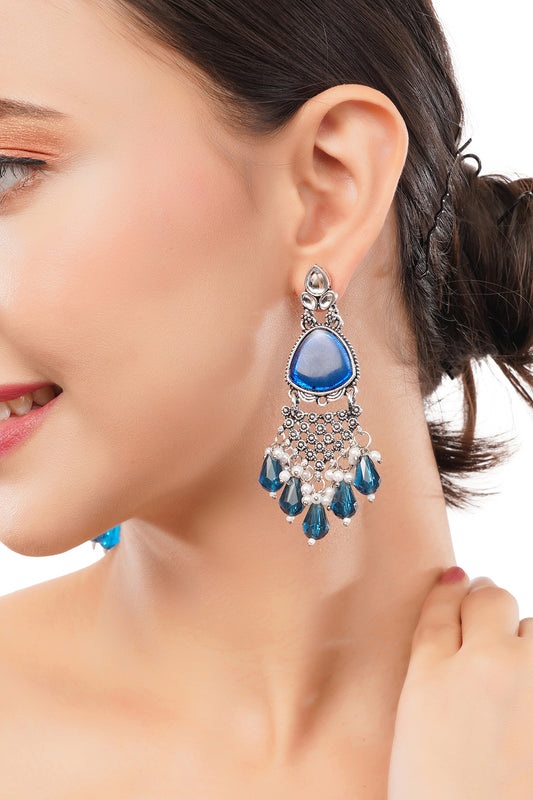 Silver Oxidised Crystal Blue Pearl Earrings For Women
