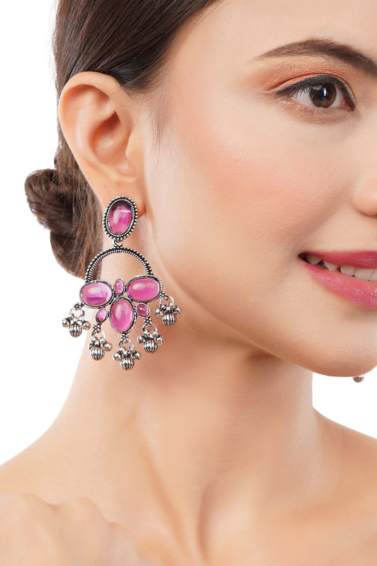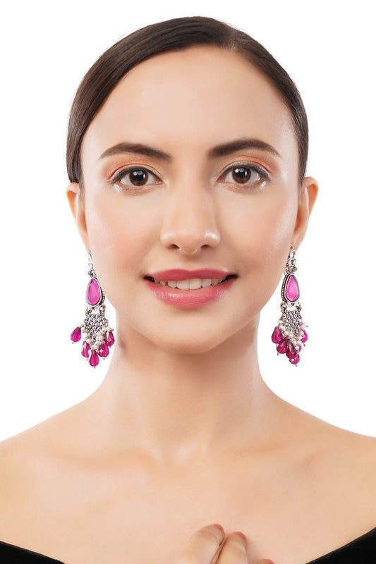 Silver Oxidise Prurple Pearl Drop Earrings For Women