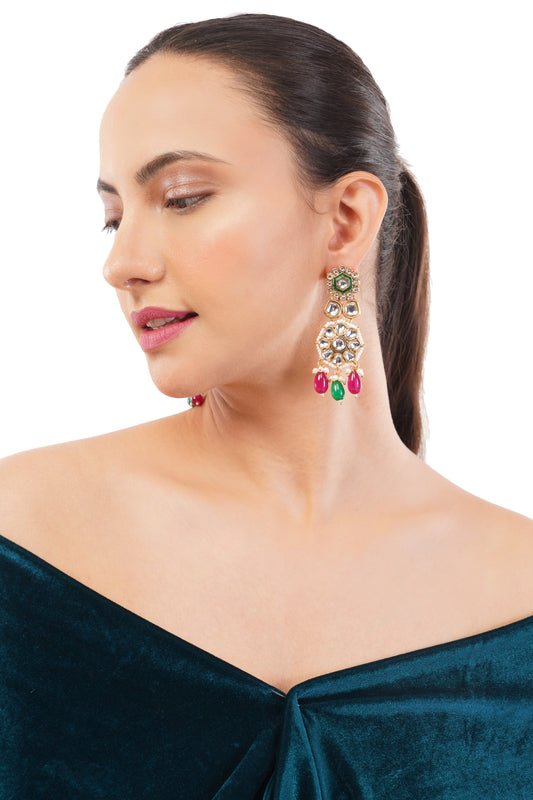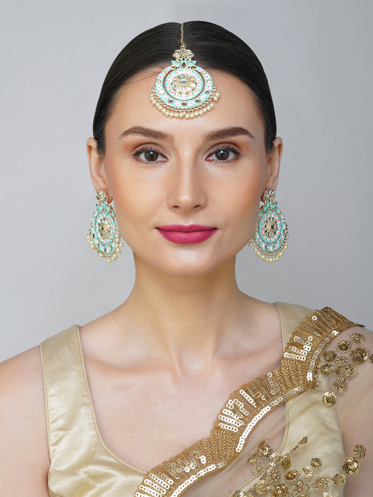 Pearl And Mirror Light Blue Minakari Earring With Maangtika