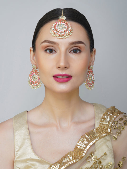 Pearl And Mirror Peach Minakari Earring With Maangtikka
