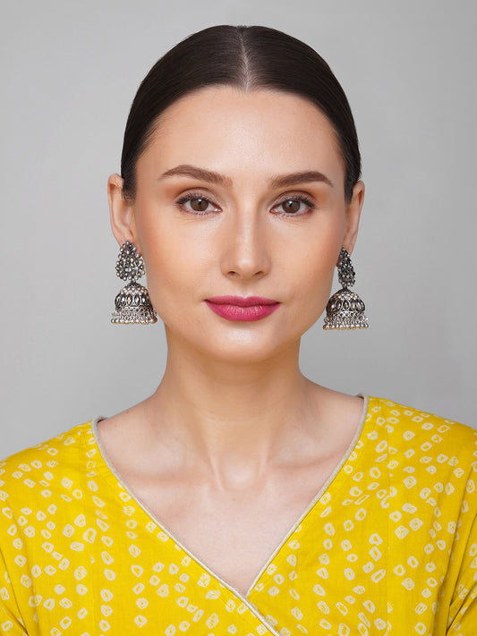 Oxidised Silver Light Green Peal Jhumka Earrings