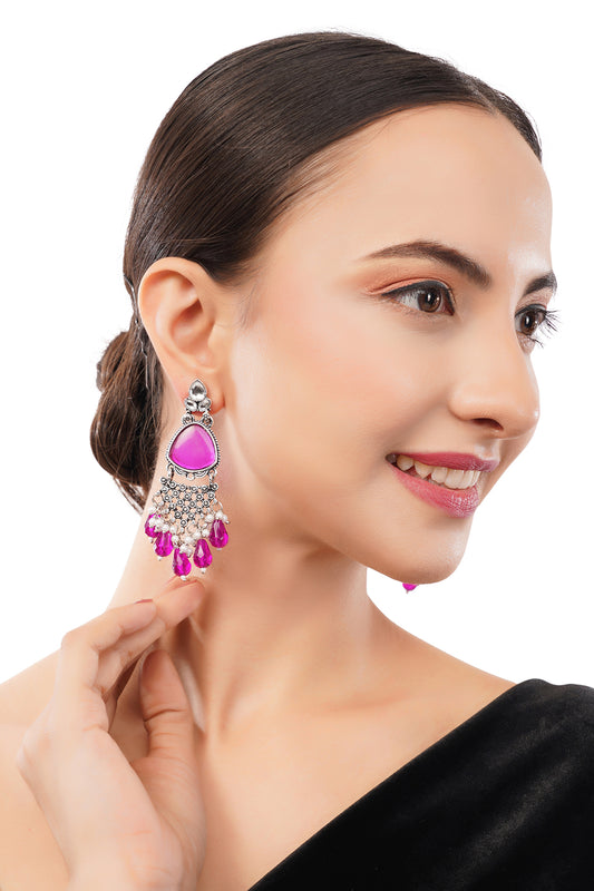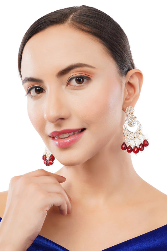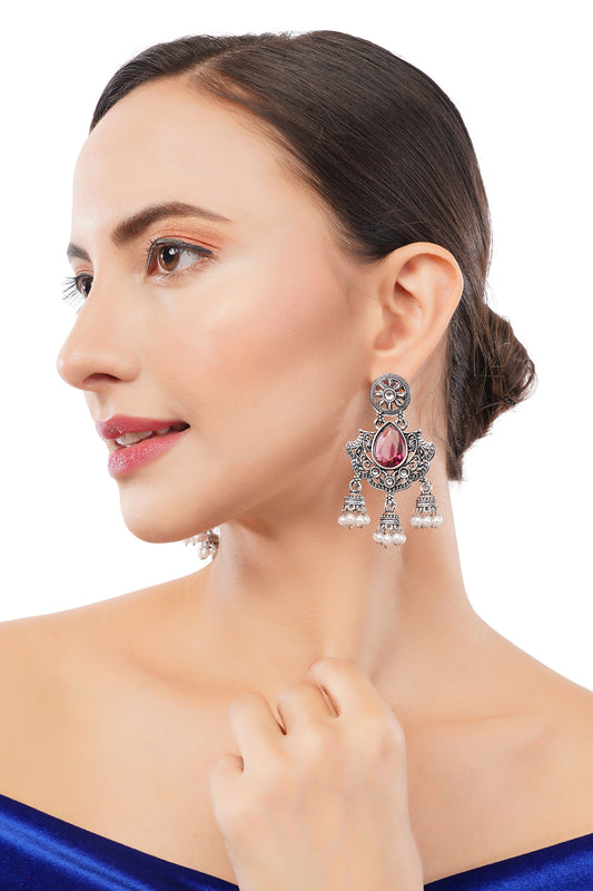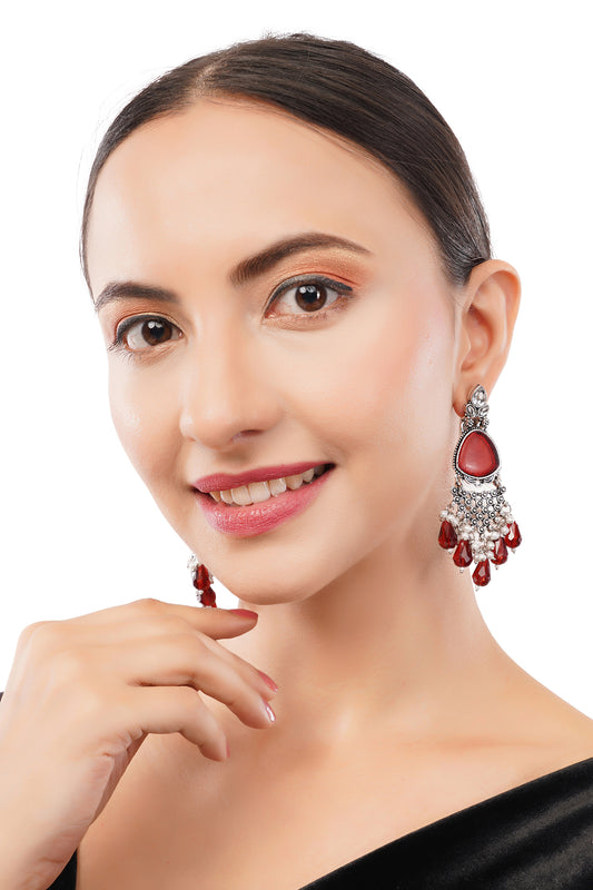 Oxidised Silver Crystal Red Stone Pearl Earrings