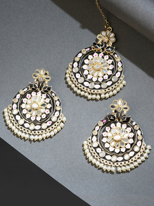 Pearl And Mirror Black Minakari Earring With Maangtikka