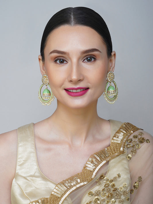 Kundan And Pearl Minakari Green Jhumki Earrings For Women
