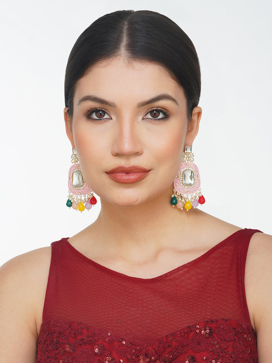 Gold Tone Pink Kundan Minakari Stone Long Earring