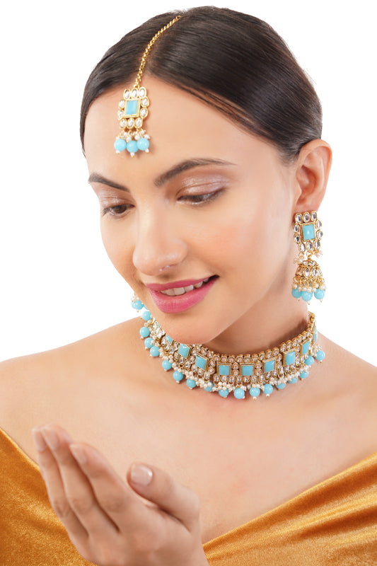 Gold pleated Turquoise Blue Kundan Necklace And Earrings Set