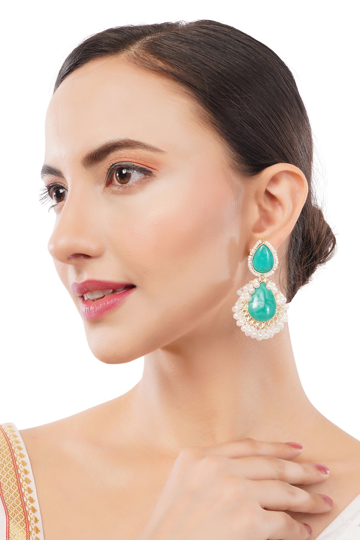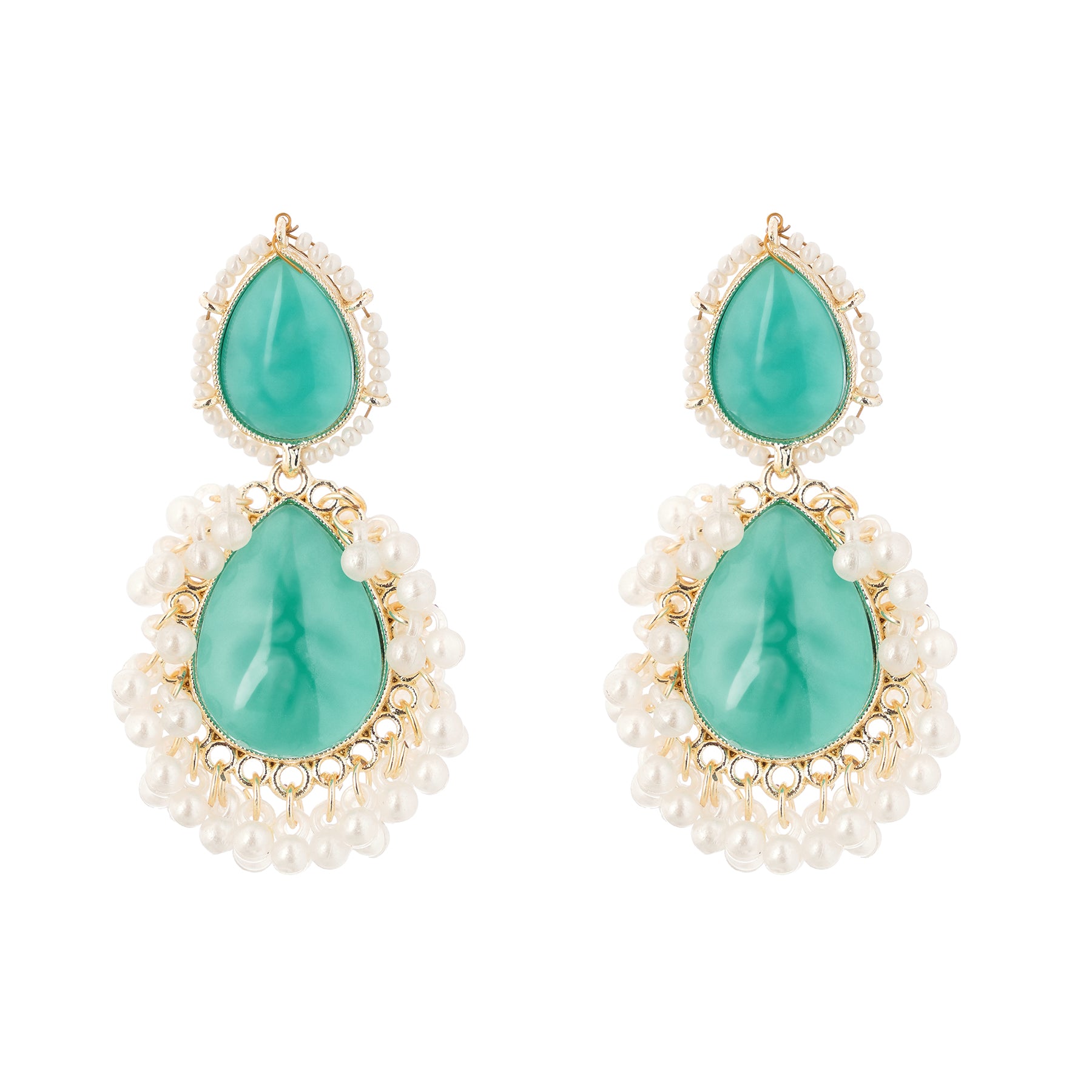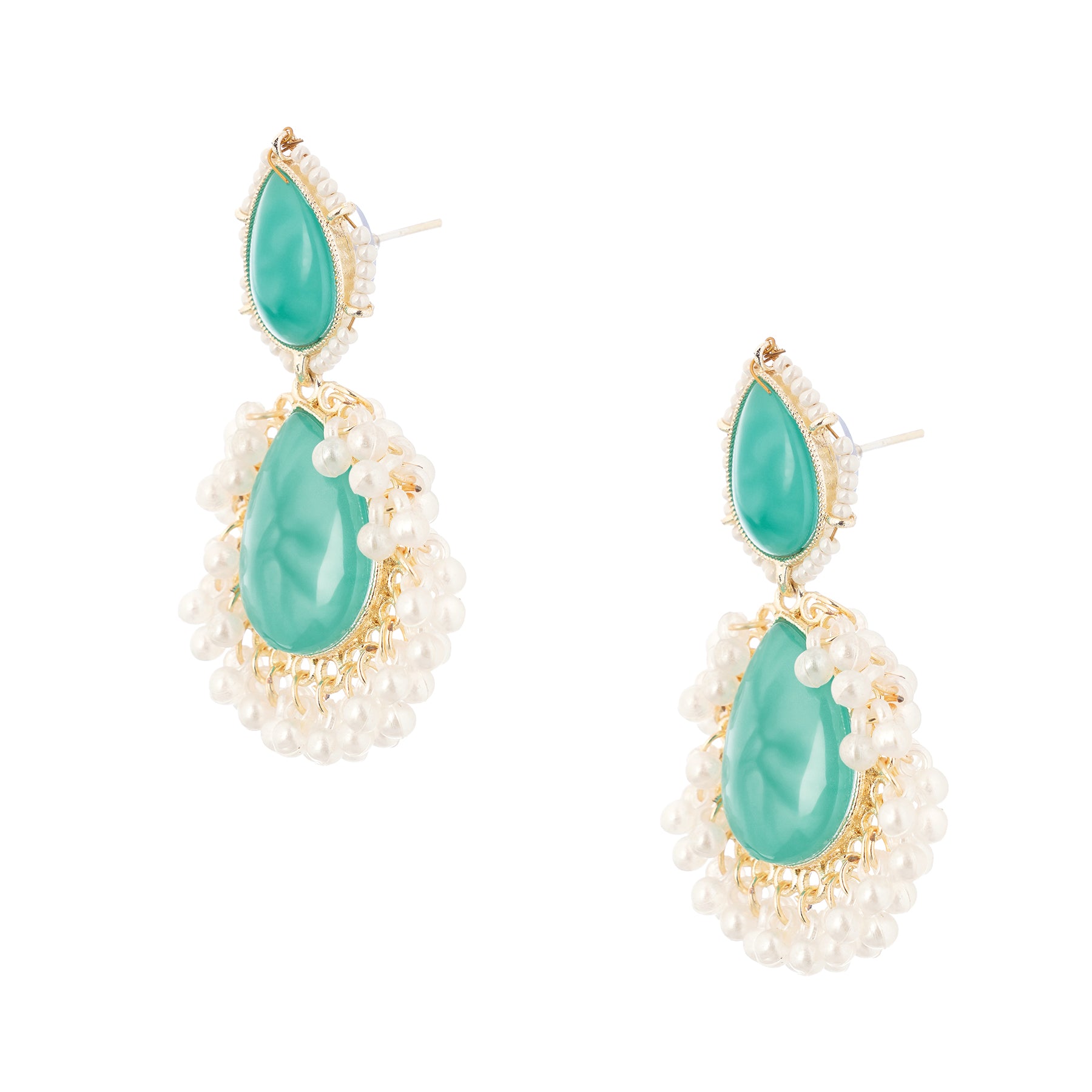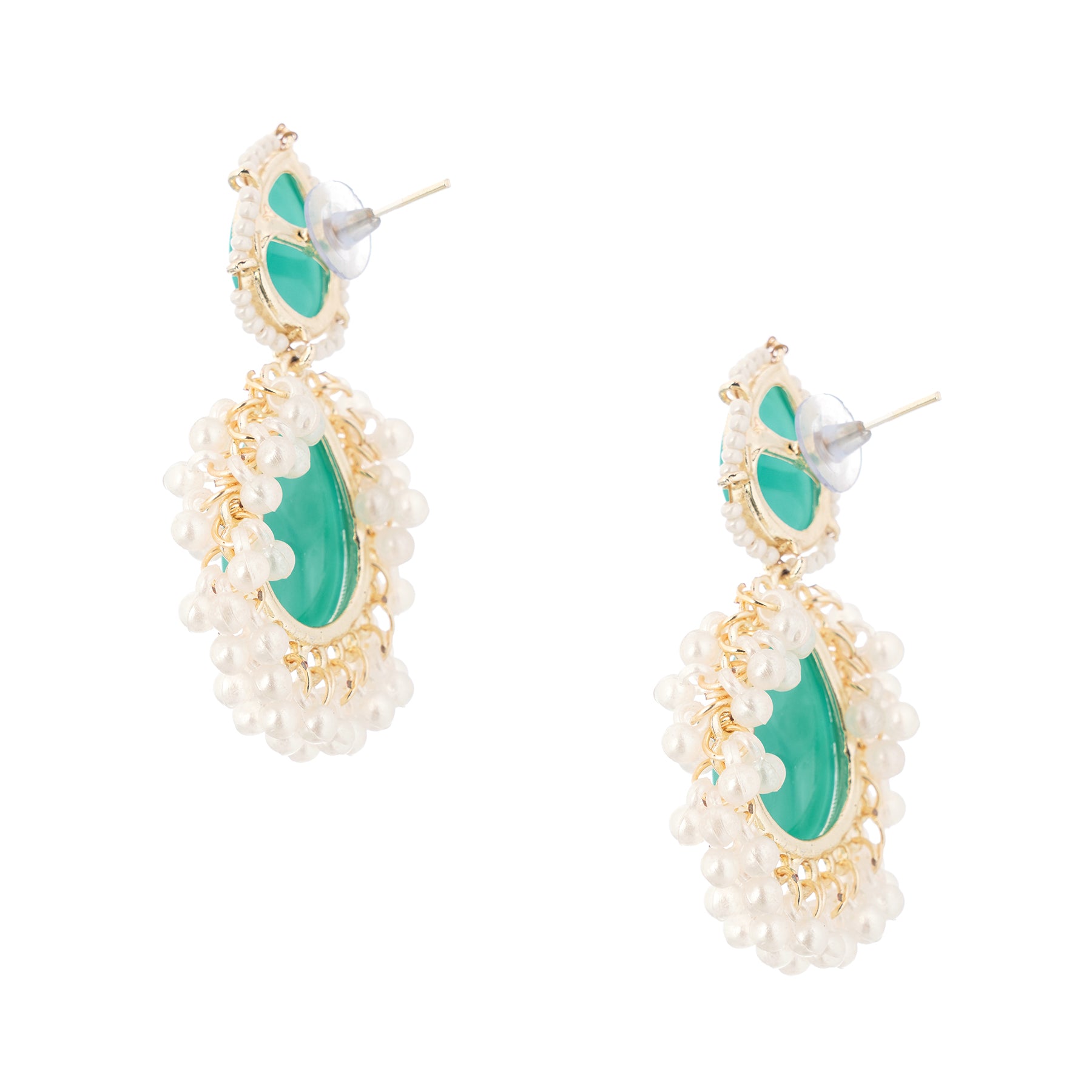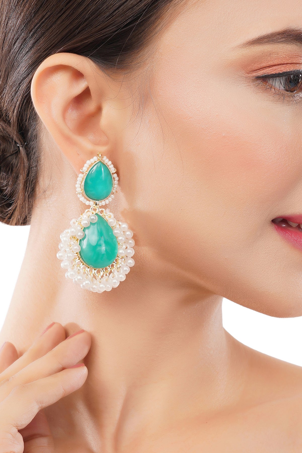 Clustertrend Gold Plated Aqua Green Embedded White Pearl Earrings
