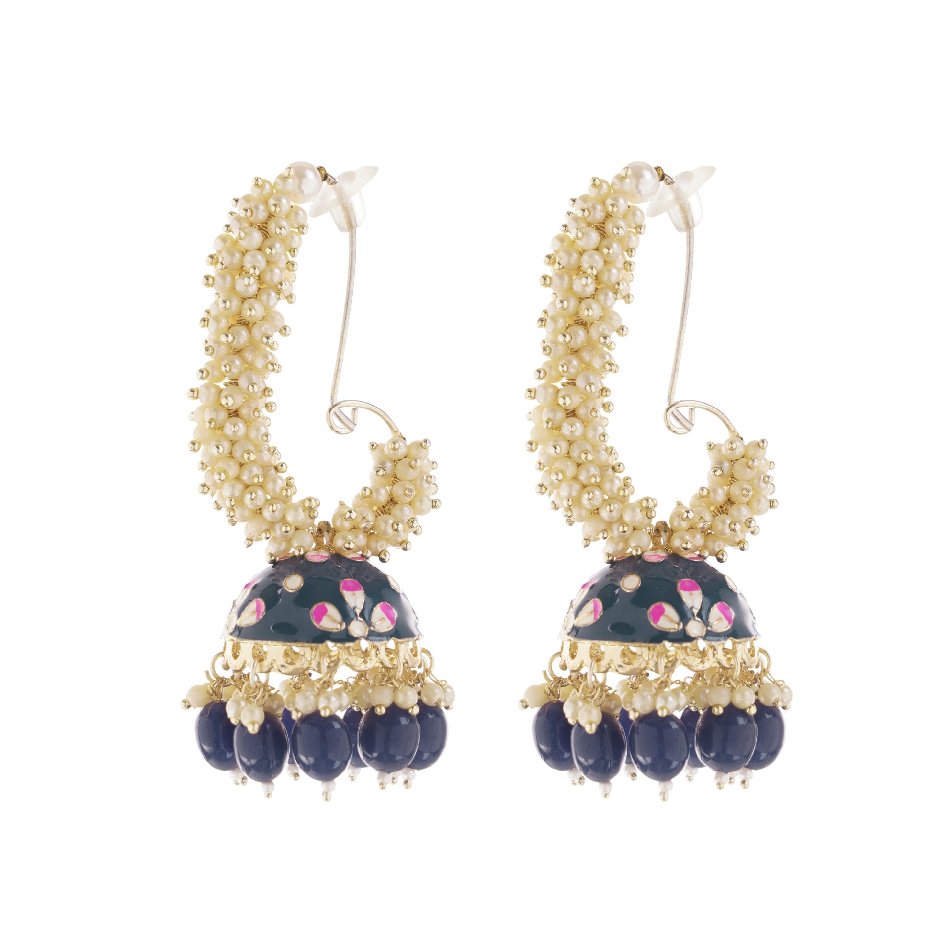 These elegant grey pearl jhumka earrings offer a sophisticated twist on a classic design. The subtle shimmer of the grey pearls adds a touch of understated glamour, making them versatile enough for both formal occasions and adding a refined touch to everyday outfits. The jhumka silhouette, with its delicate dangling bells, provides graceful movement and a hint of traditional charm. Crafted with attention to detail, these earrings are perfect for the woman who appreciates timeless elegance with a modern edge.
