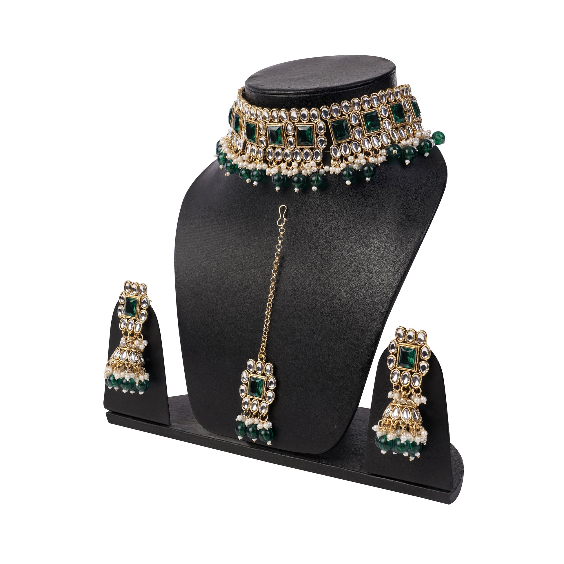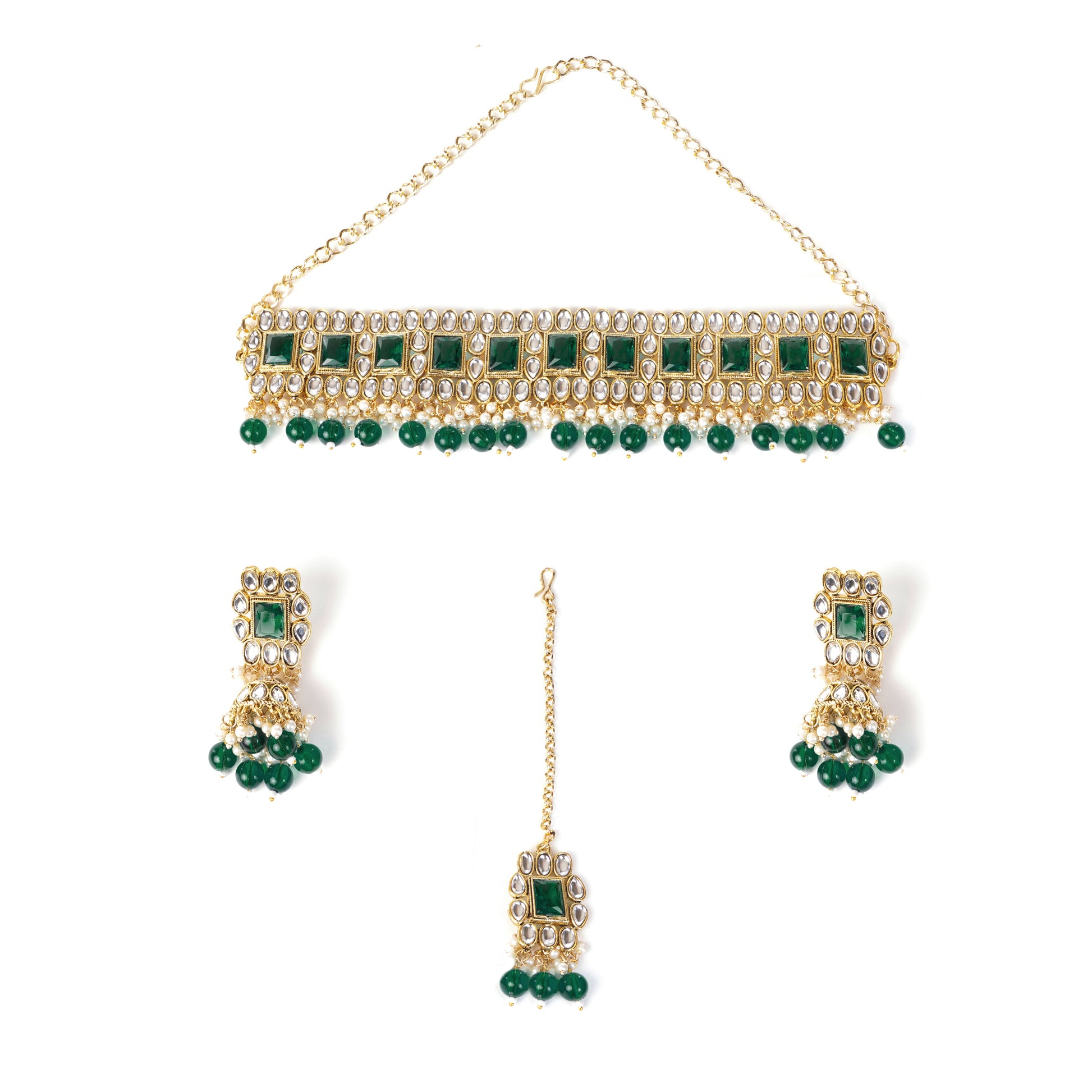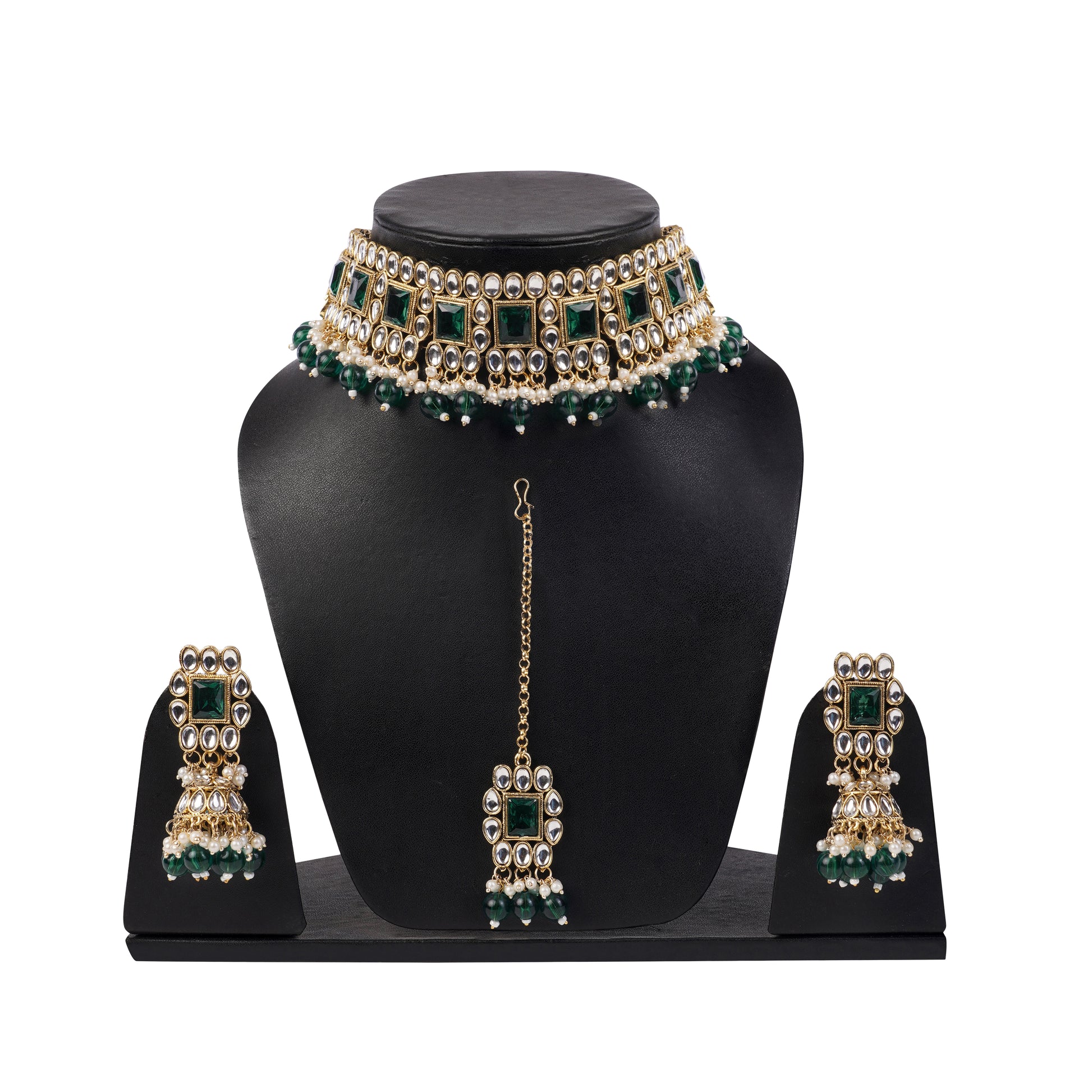 Gold Plated Emerald Green Kundan Necklace And Earrings Set
