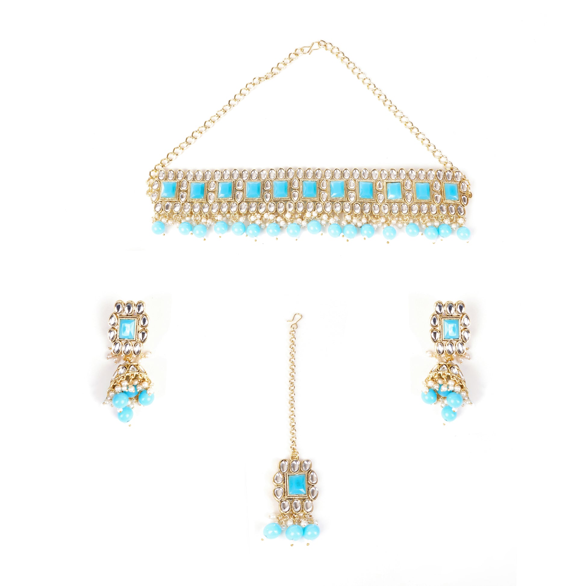 Gold-Plated Blue Kundan Studded Necklace Set For Women