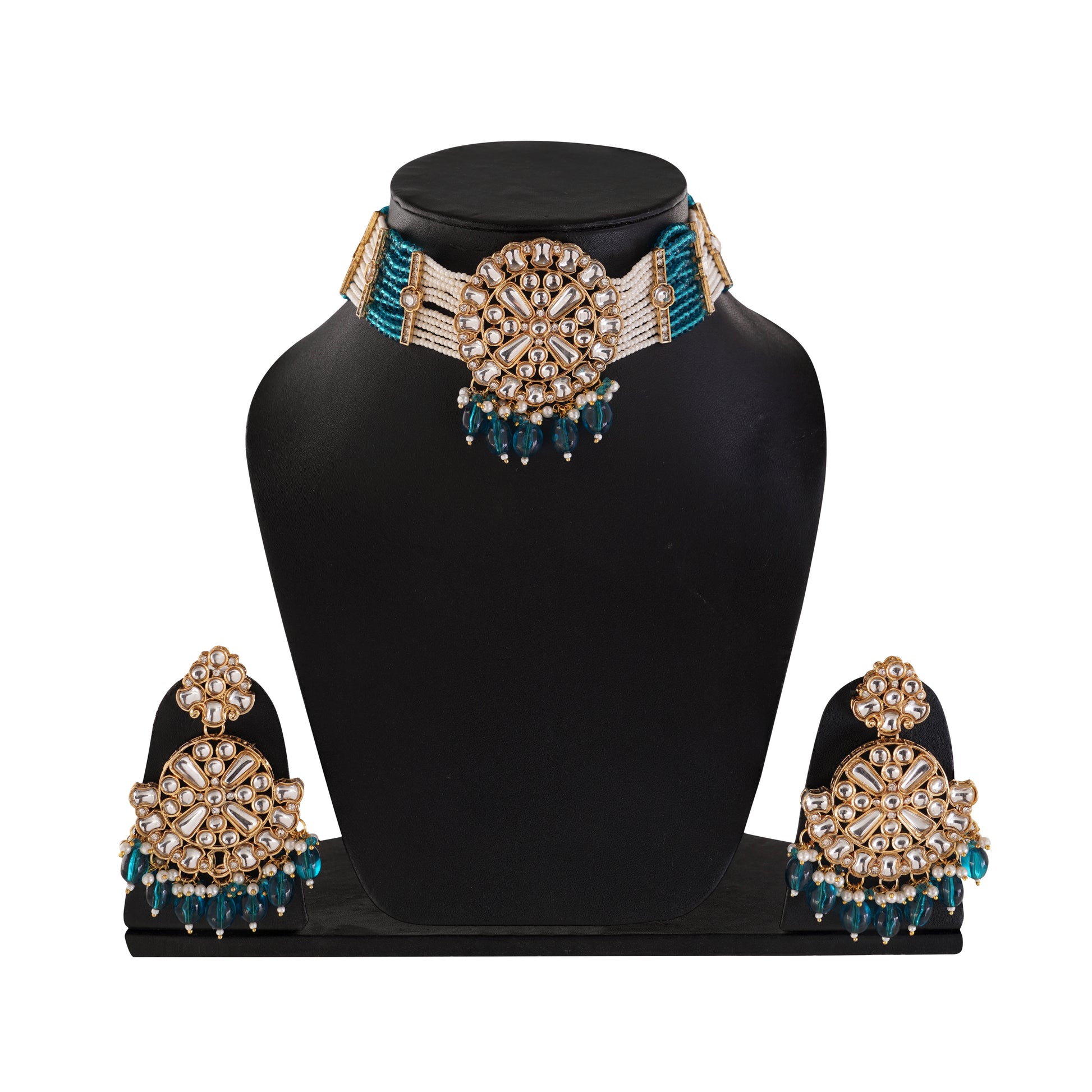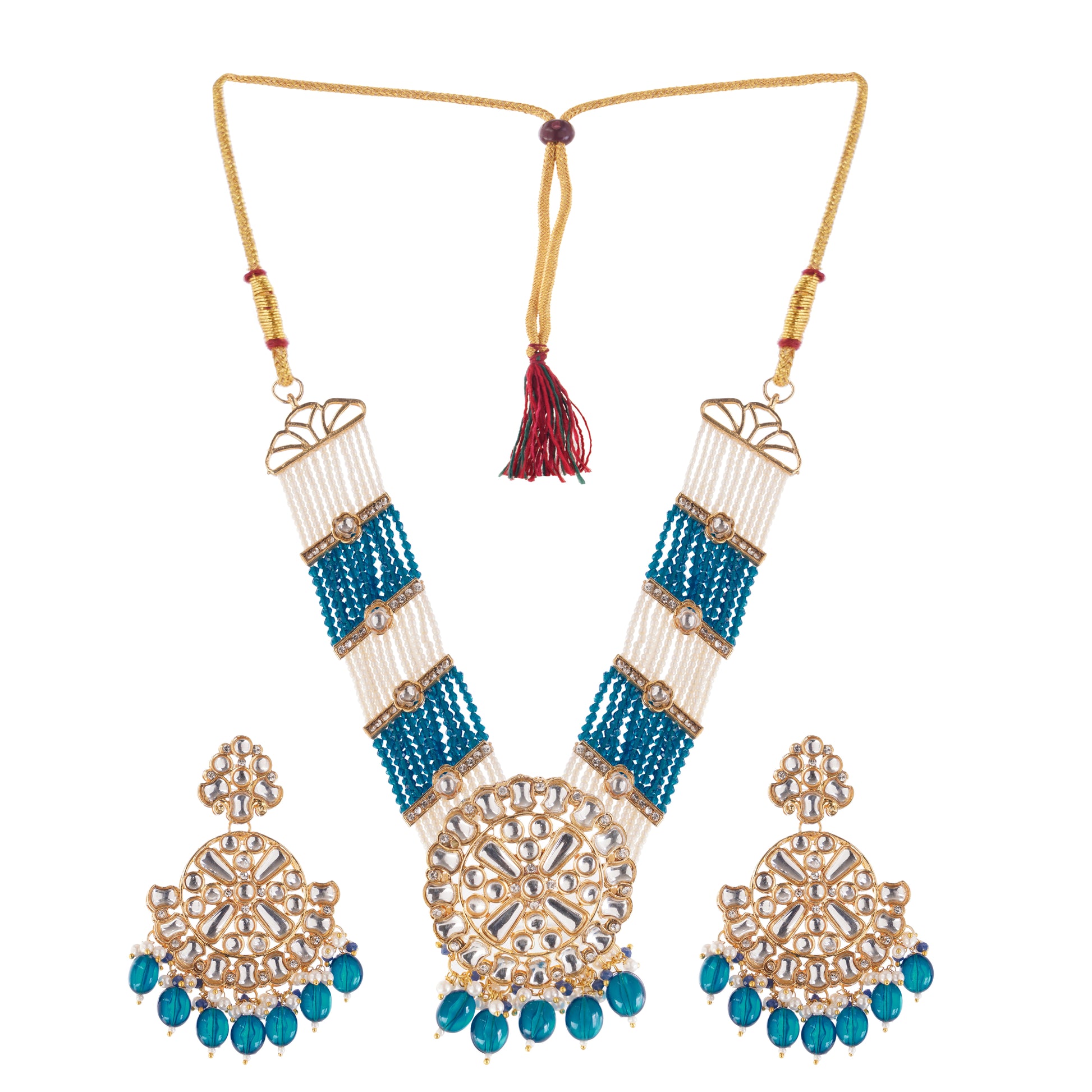This stunning necklace and earrings set features a beautiful gold-plated design adorned with turquoise blue Kundan stones. It's a perfect accessory to elevate any outfit, adding a touch of elegance and charm. Whether you're dressing up for a special occasion or looking to enhance your everyday style, this set is a fantastic choice. The vibrant colors and intricate craftsmanship make it a standout piece that you'll love to wear.