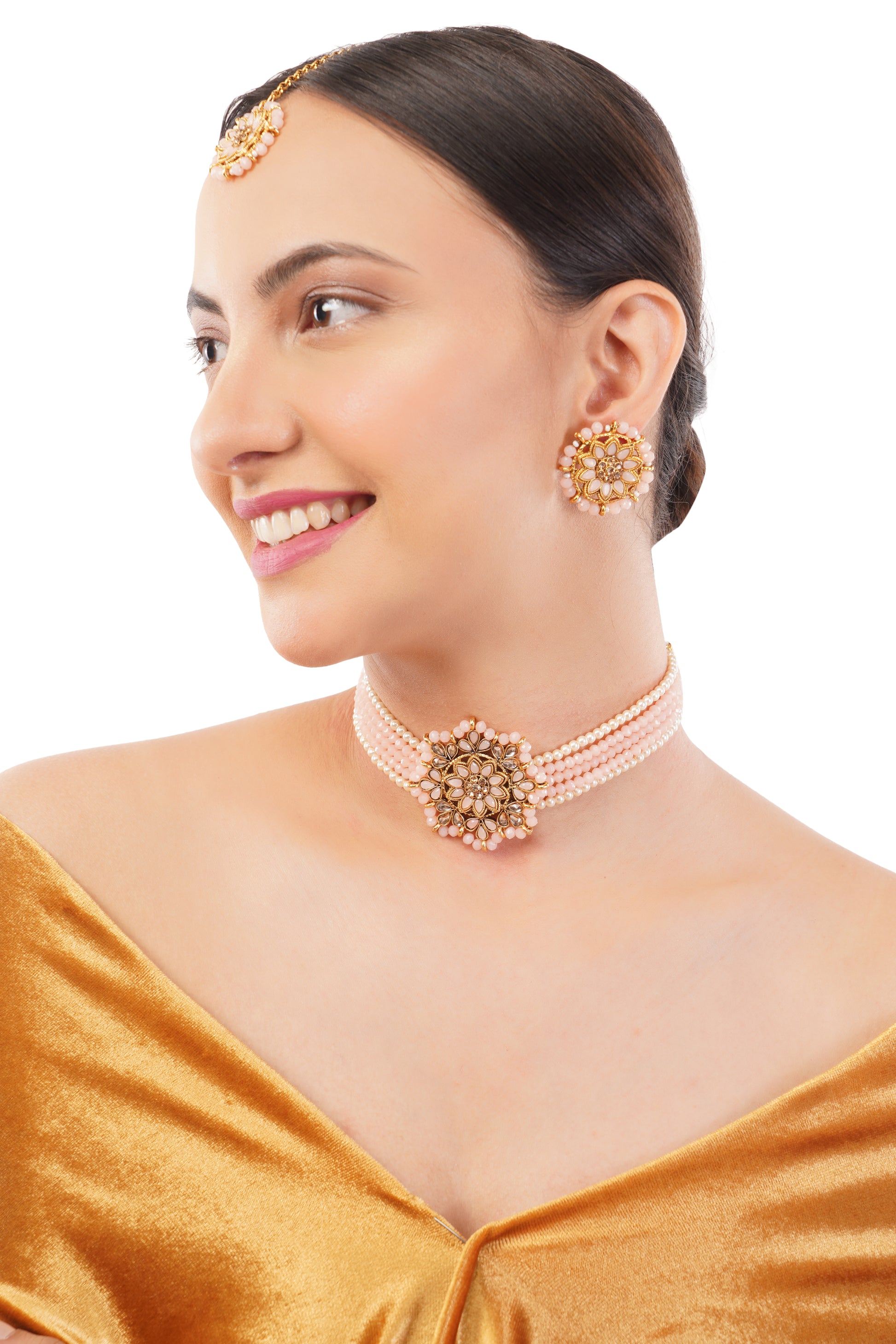 Light Peach Pearl Beadded Jewellery Necklace And Earrings Set