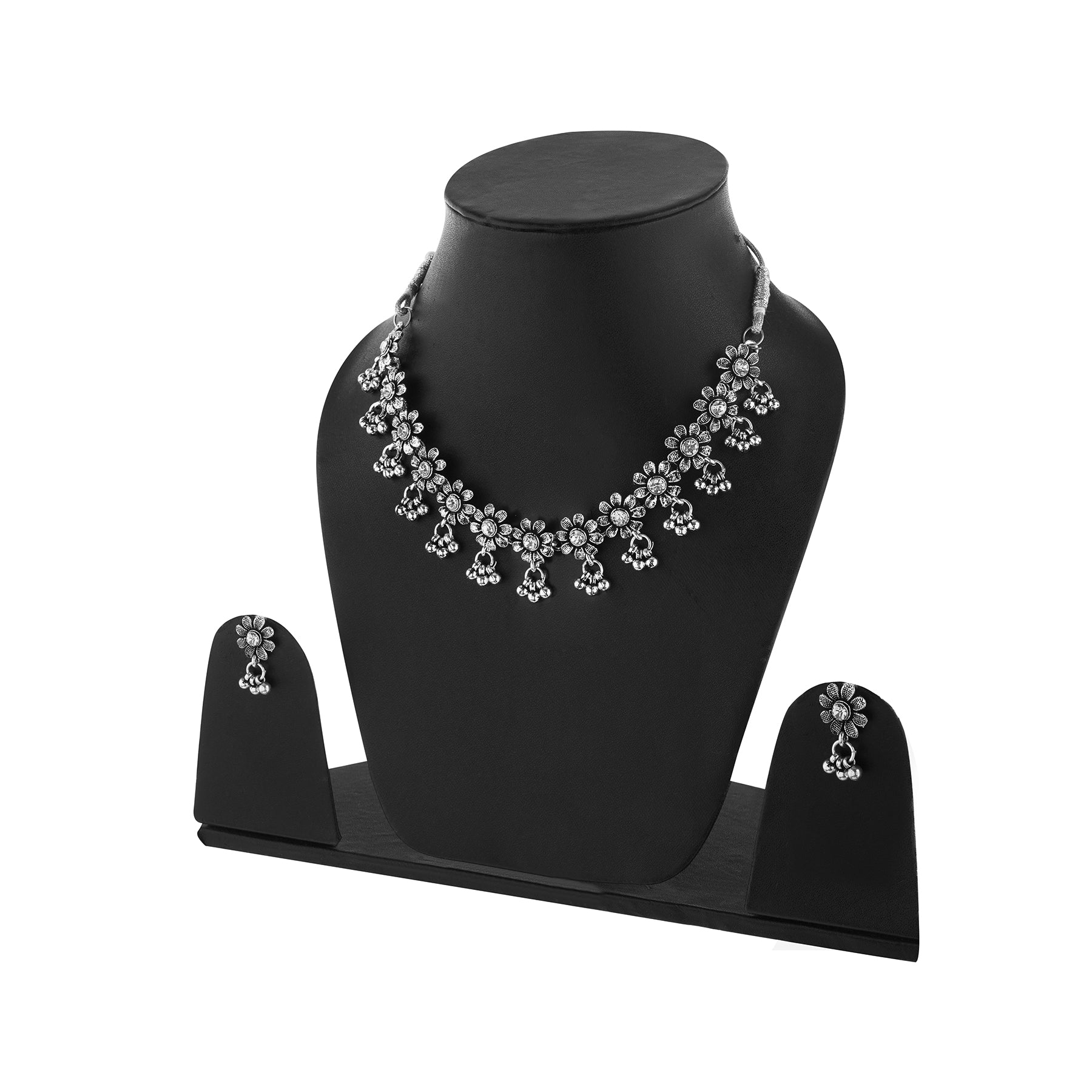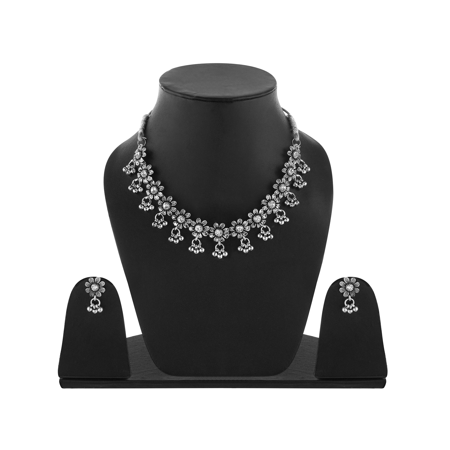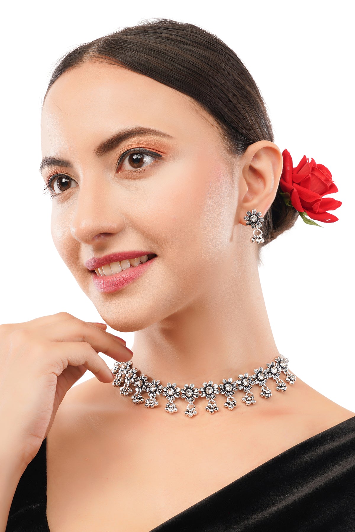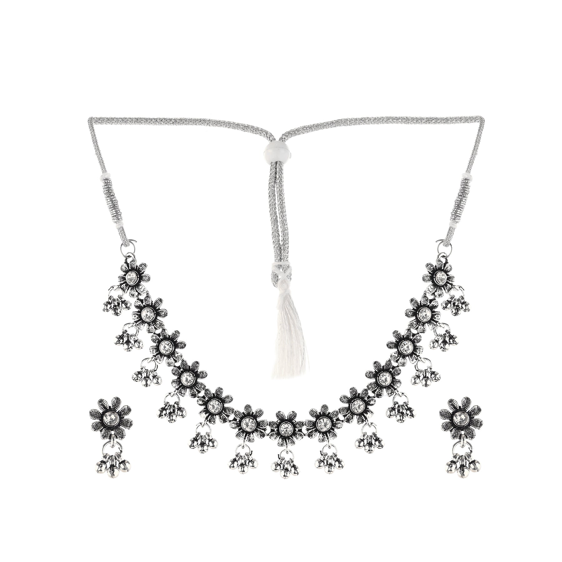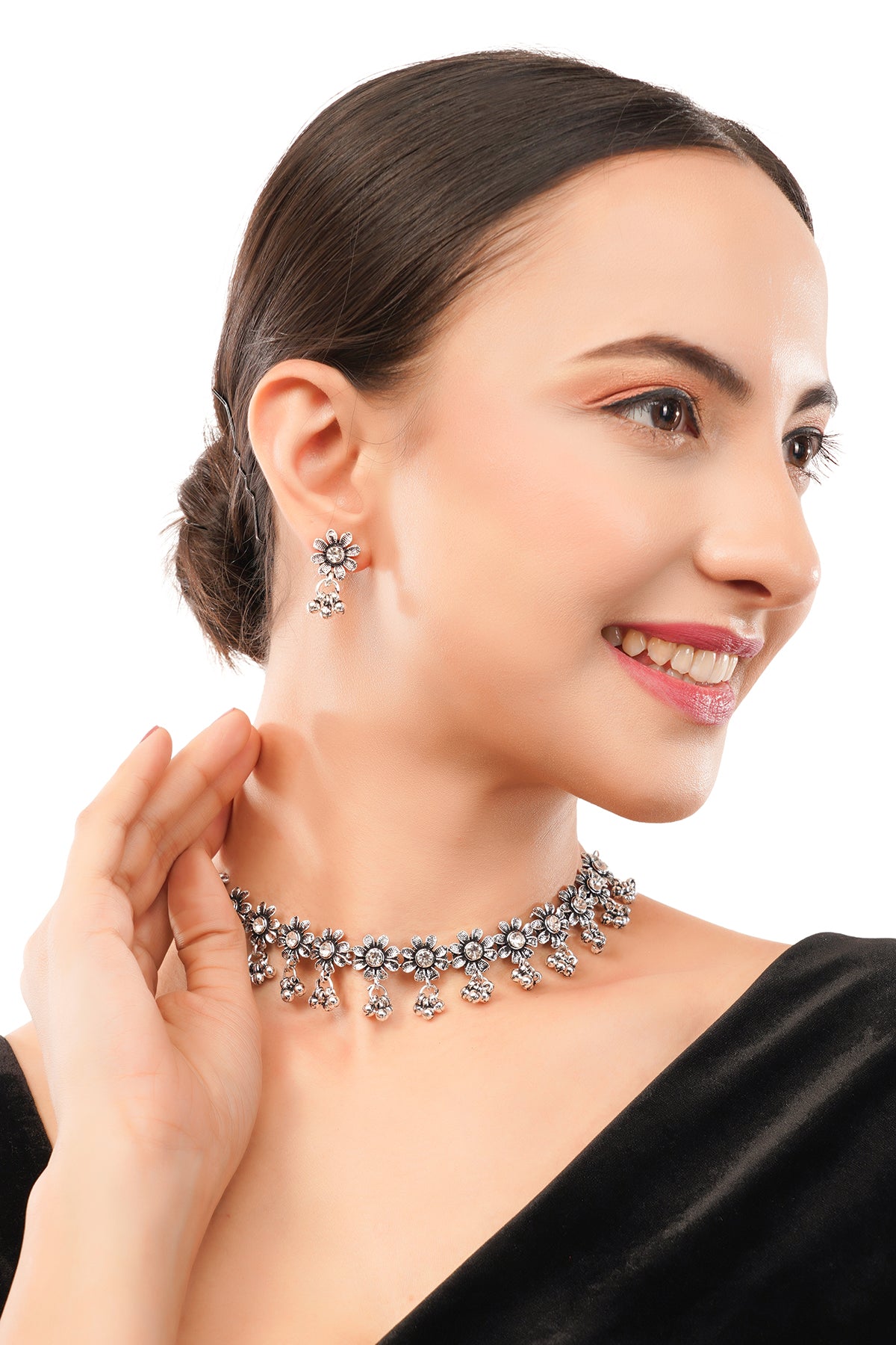 Silver Oxidised White Stone Choker Necklace With Earrings