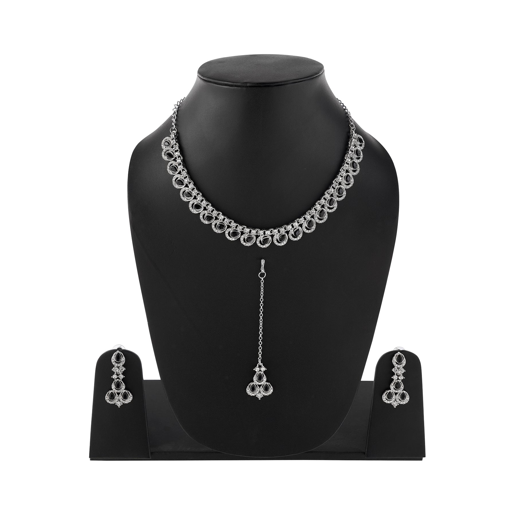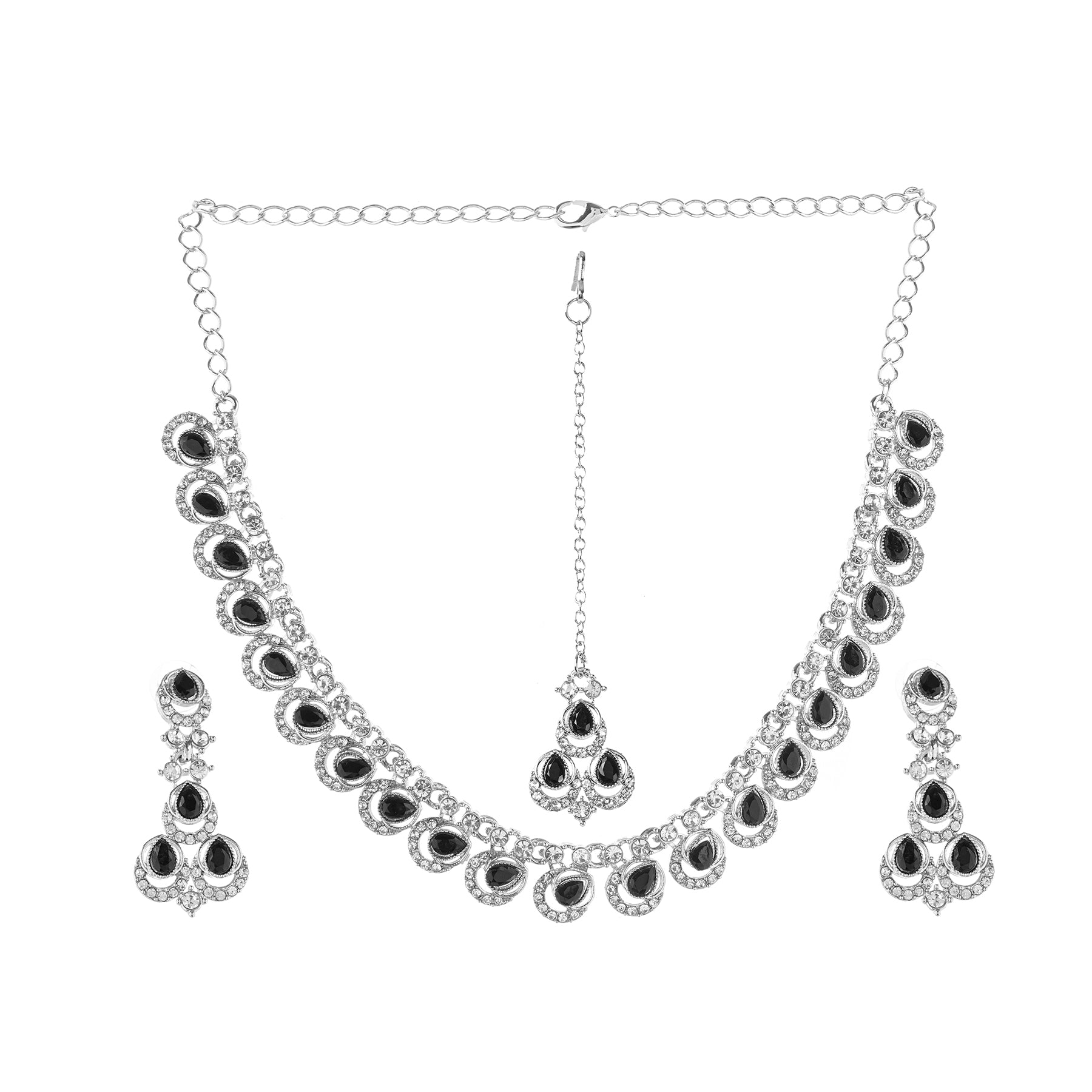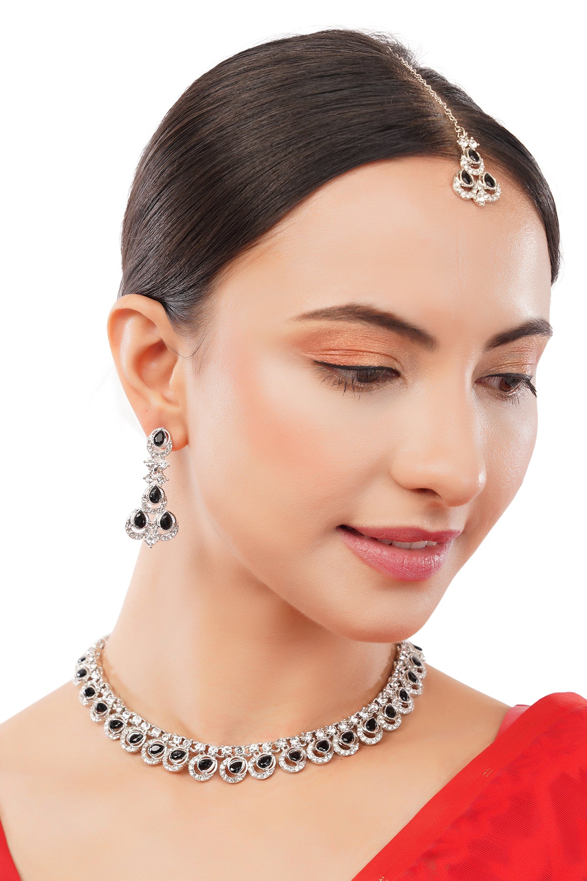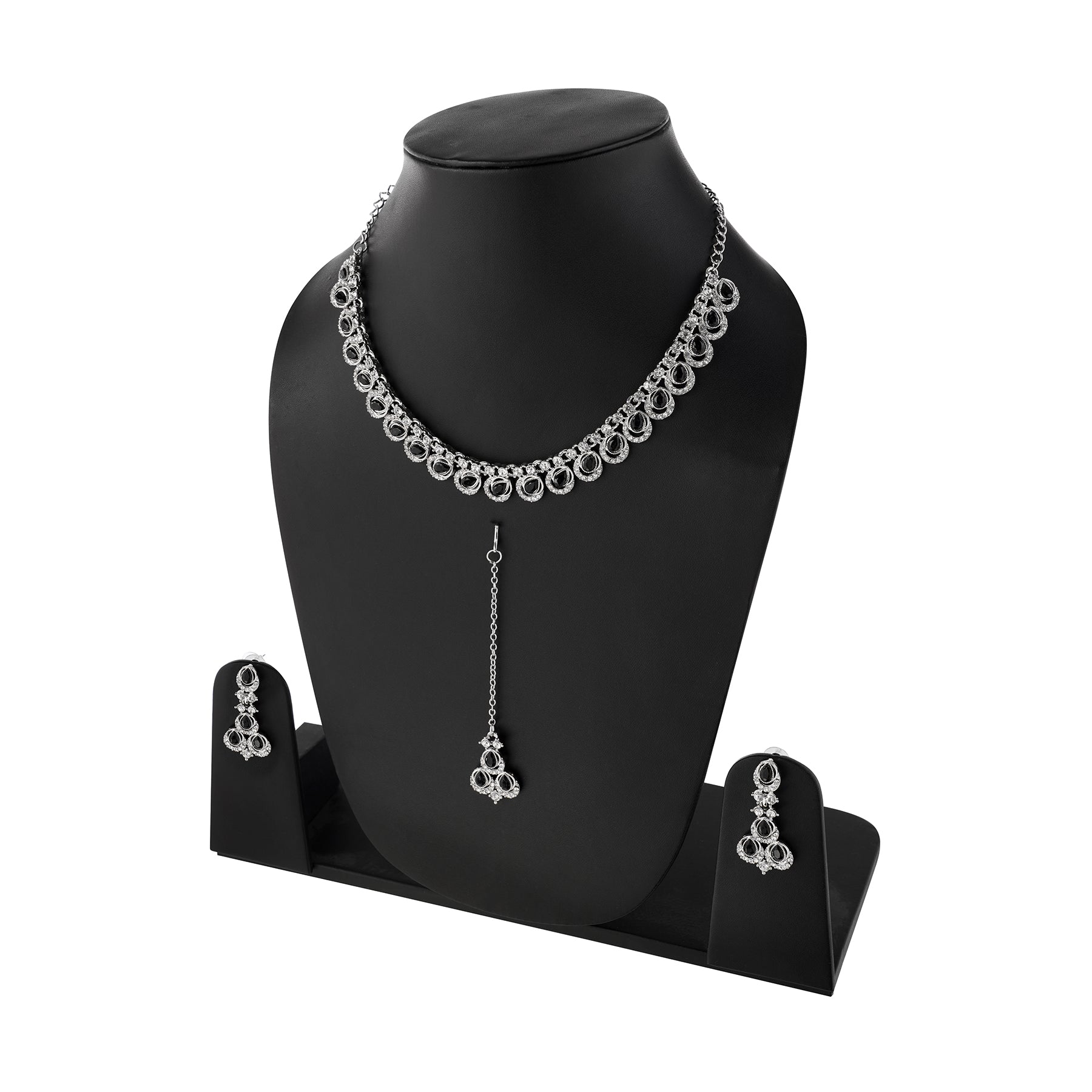 Silver Plated Black Stone Diamond Necklace With Mangtika Set