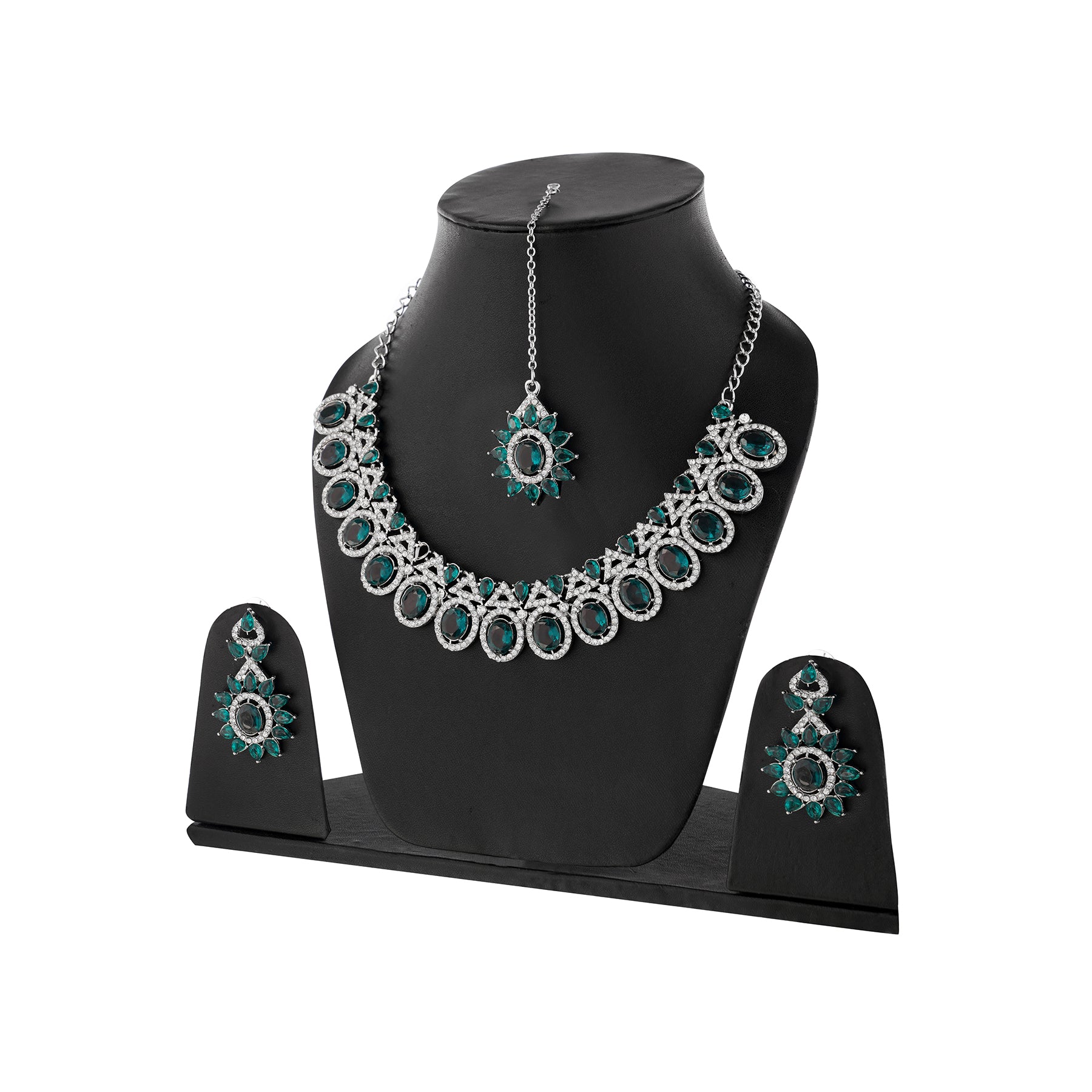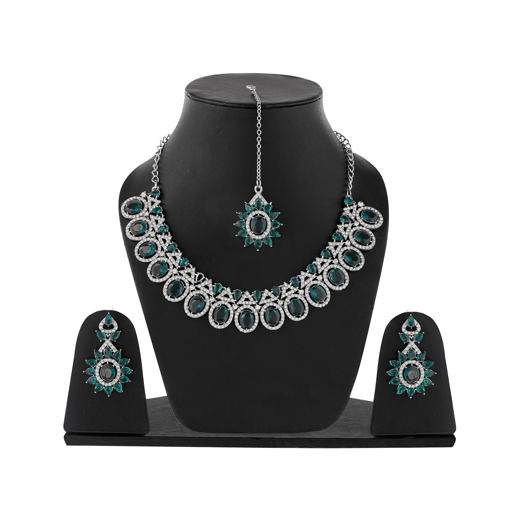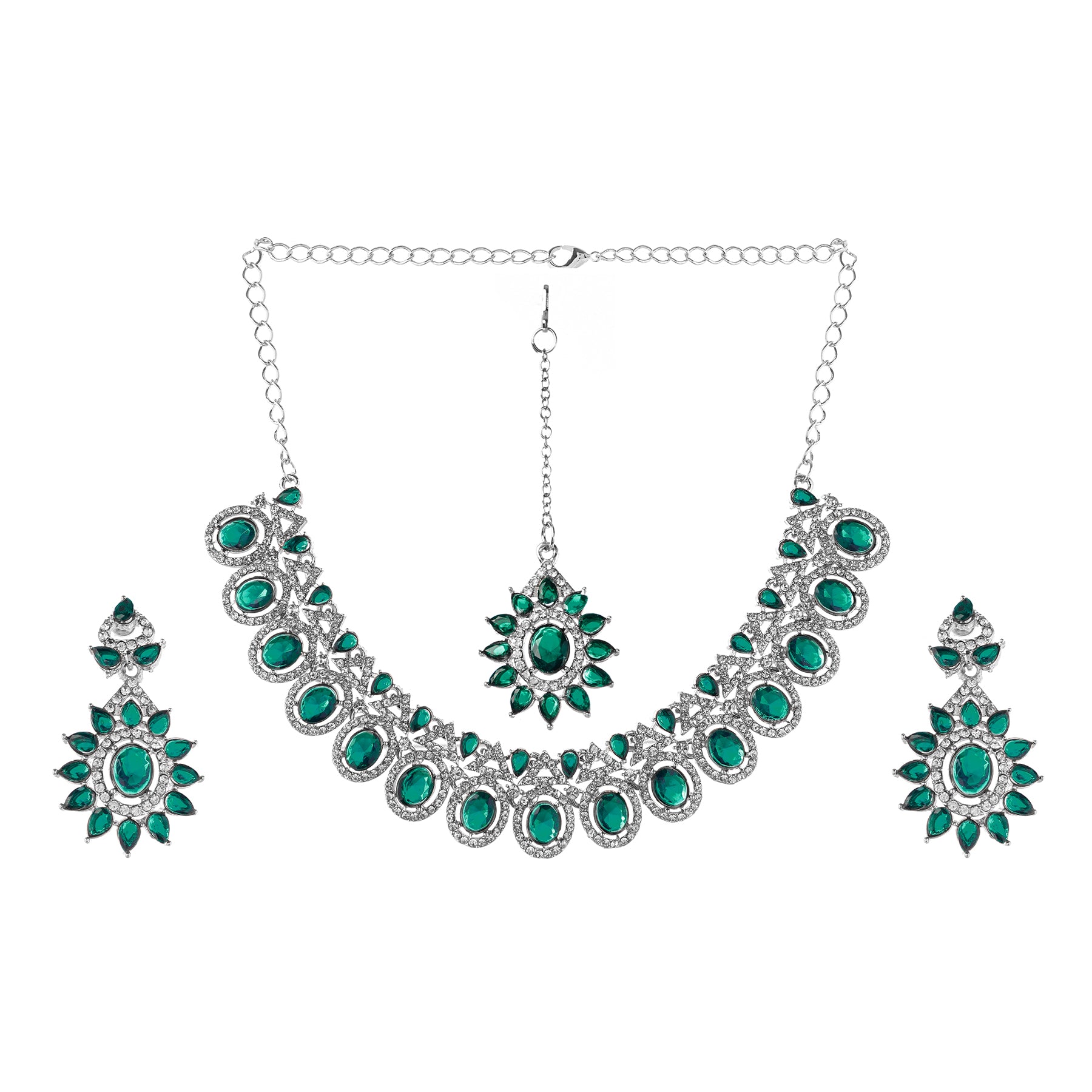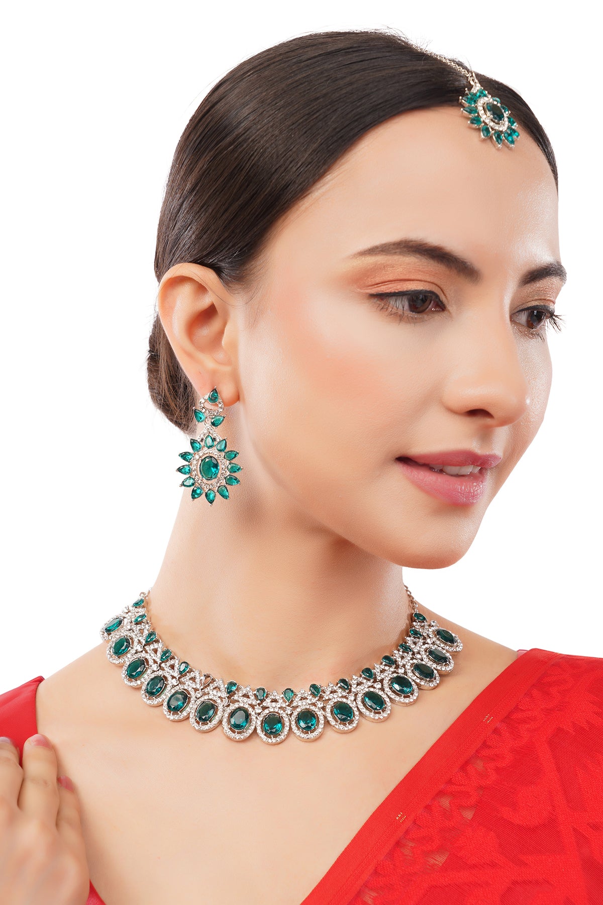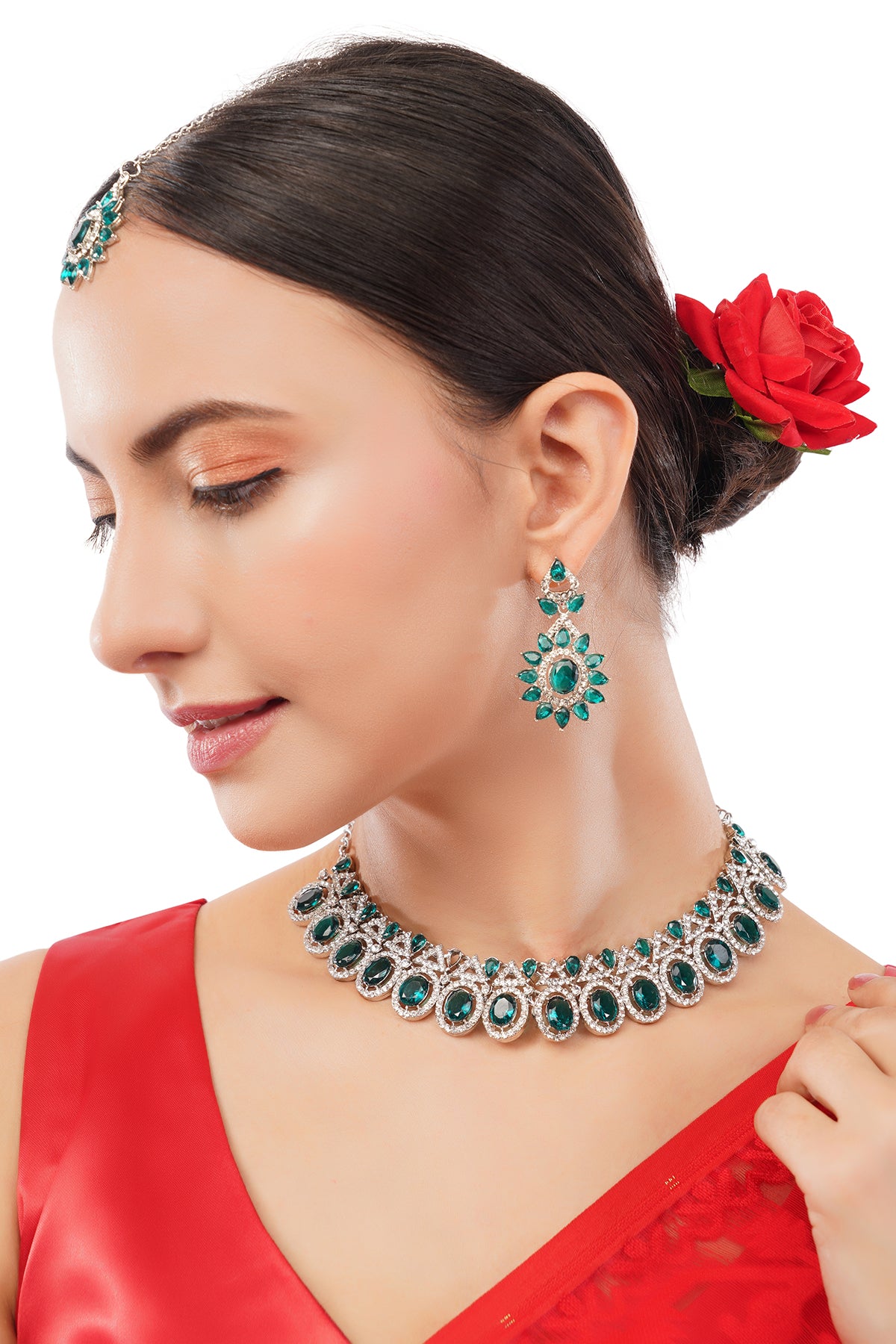 Silver Plated Green Stone Diamond Necklace With Earrings