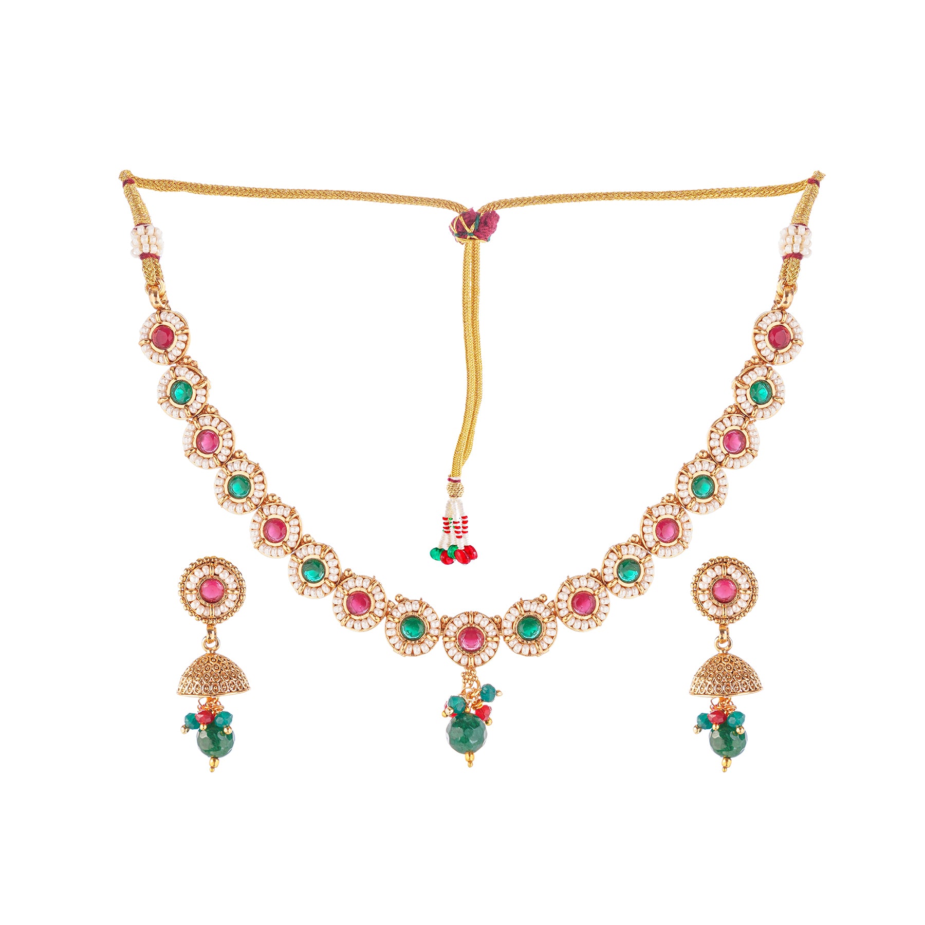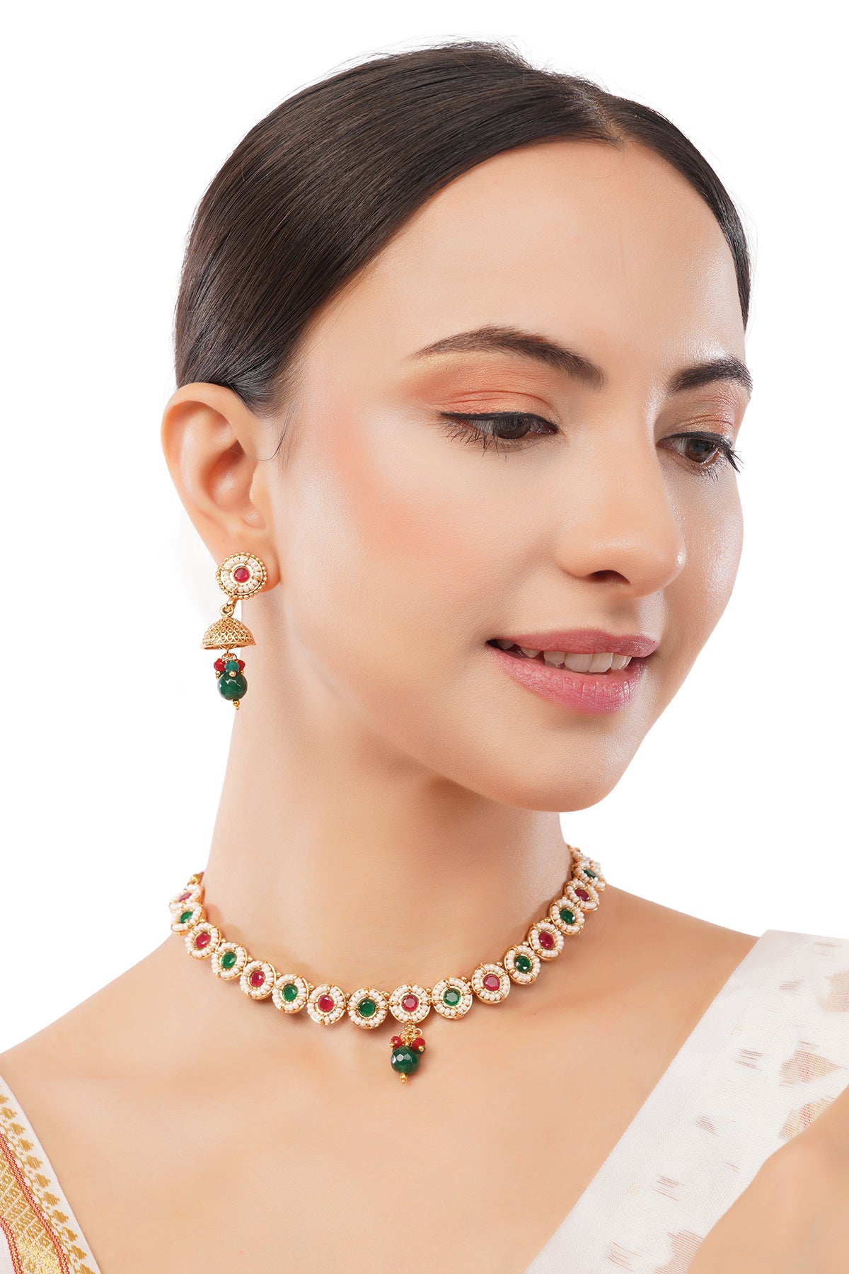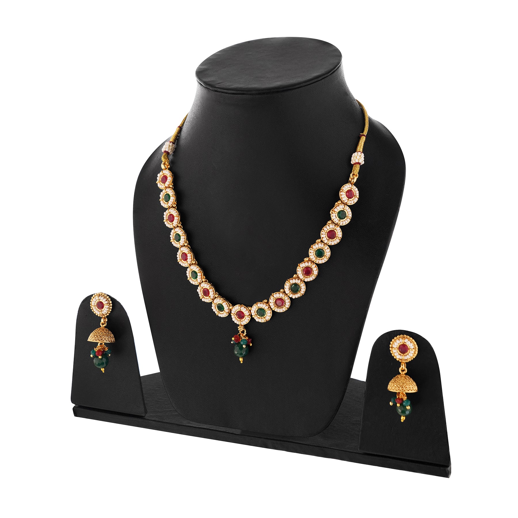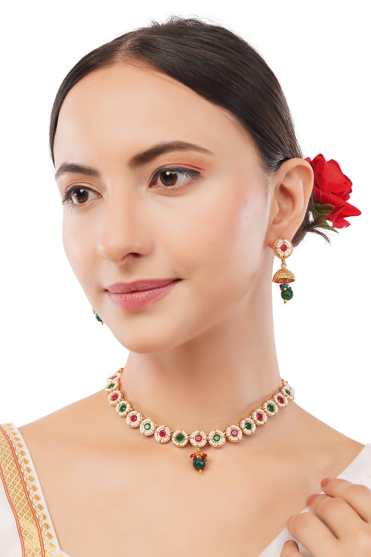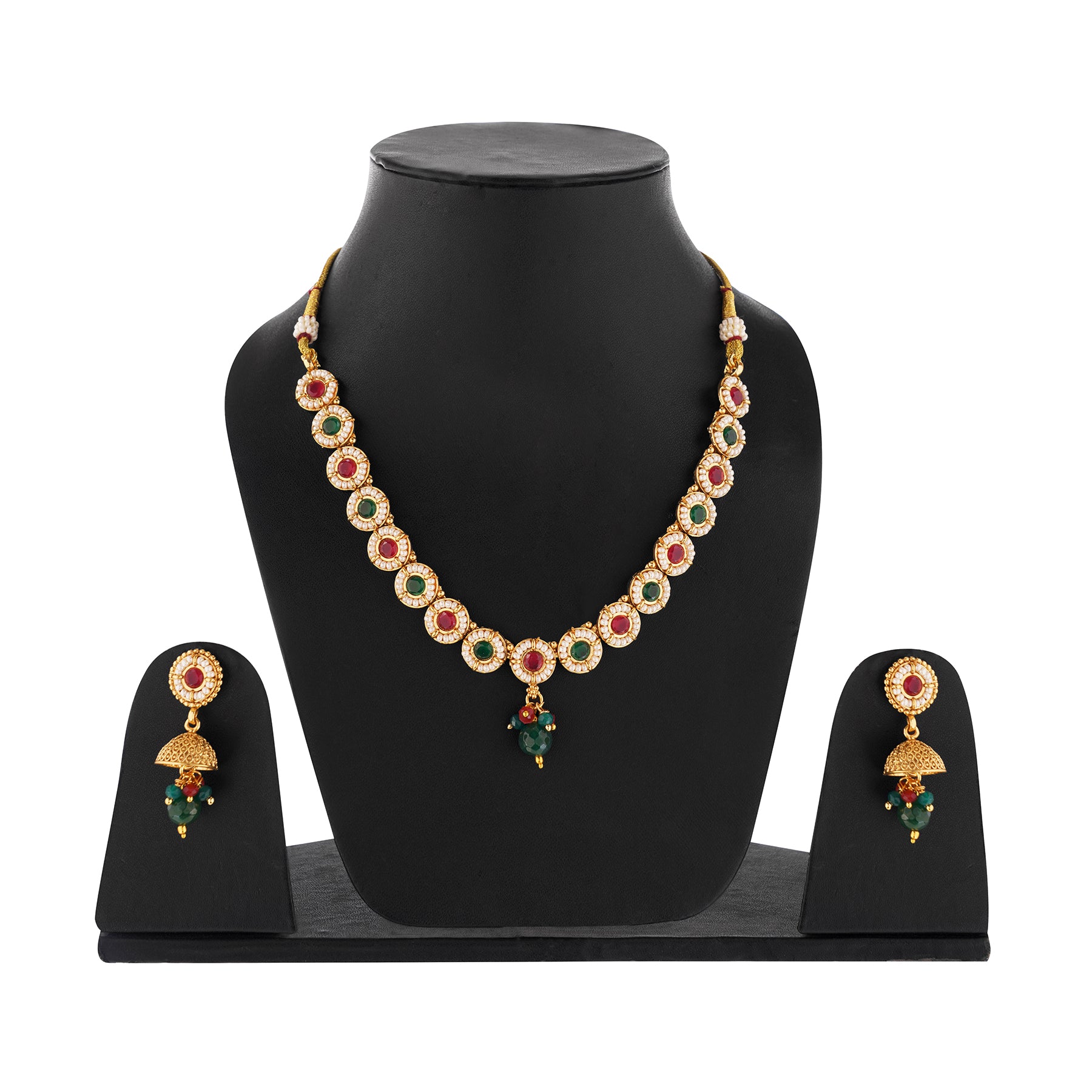 Traditional Gold Plated Red And Green Stone Necklace With Jhumki earrings
